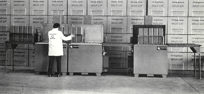 The flagship Magnus Miji-Lif in its early stages of design almost 75 years ago shown next to the latest design of the original pneumatic platform agitation parts washer.