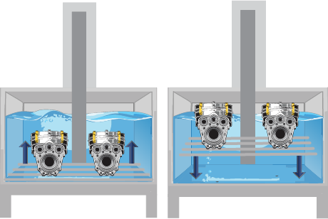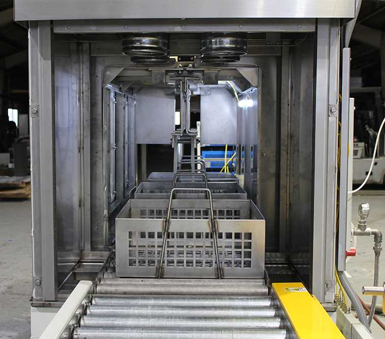 Parts are placed on a mobile platform that moves up and down within the water or chemical solution. Smaller parts are often placed in a special basket to keep them secure while on the platform.