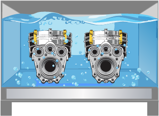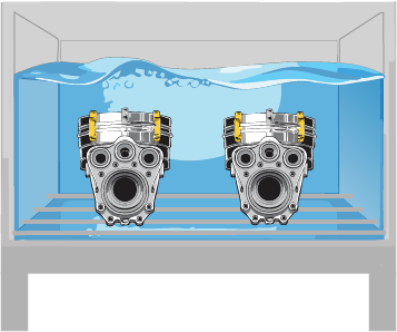 Parts are placed into a tank or tub to soak, completely submerged in water or chemical solutions.