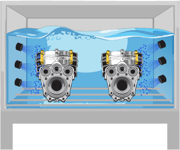 Powered by an external generator, flat ultrasonic transducers are fully submerged in the immersion tank. Ultrasonic waves generate vapor bubbles that eventually collapse under high velocity, removing the particulates from the parts. This process is called cavitation.