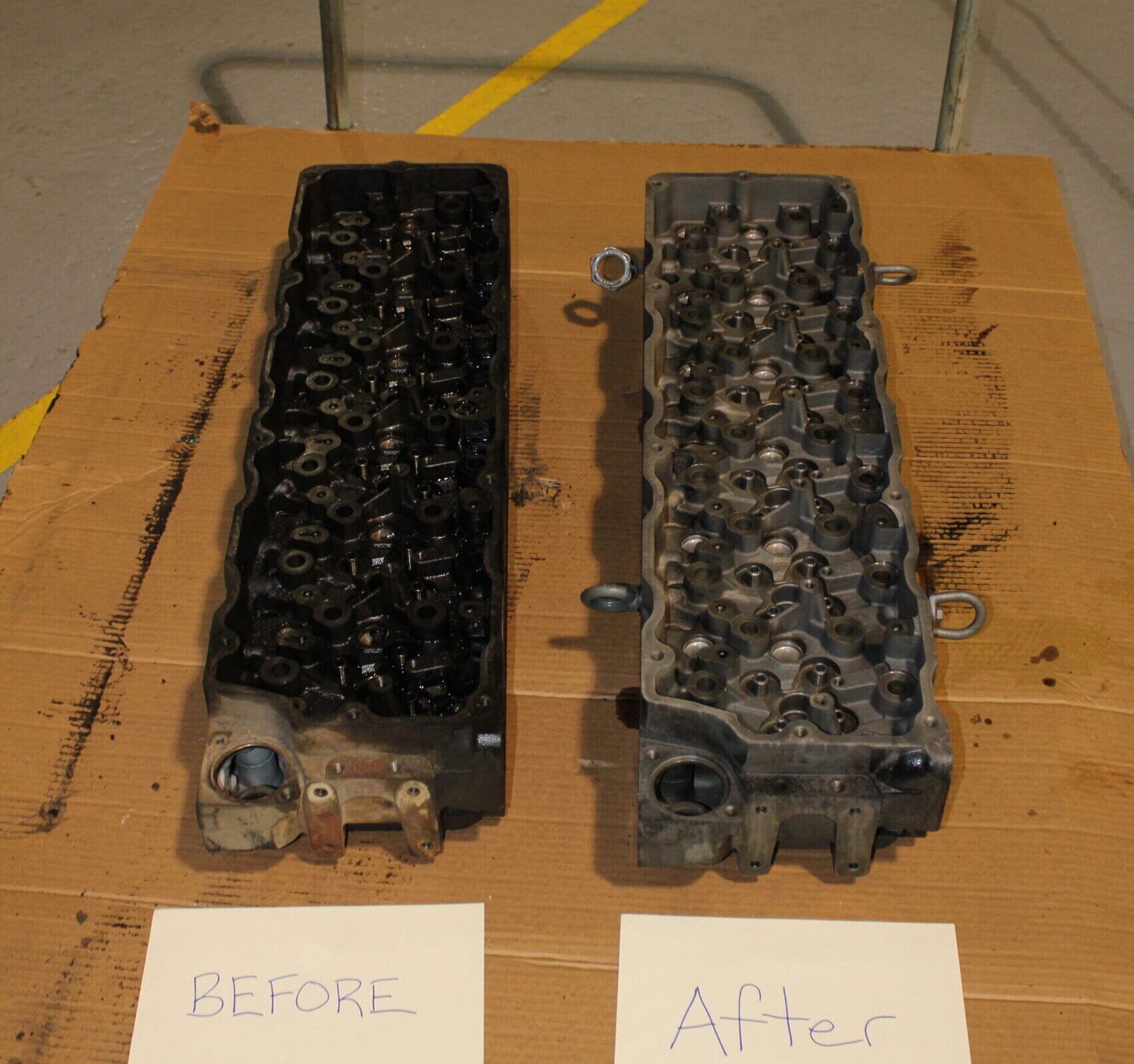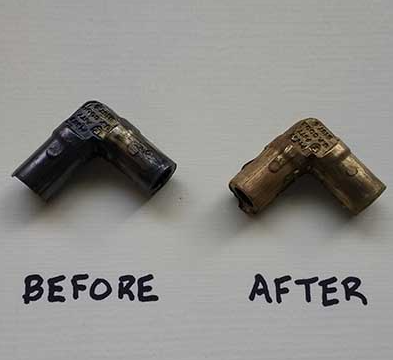 Left: Side-by-side comparison of parts before and after being cleaned in an Agitation Immersion Tank.